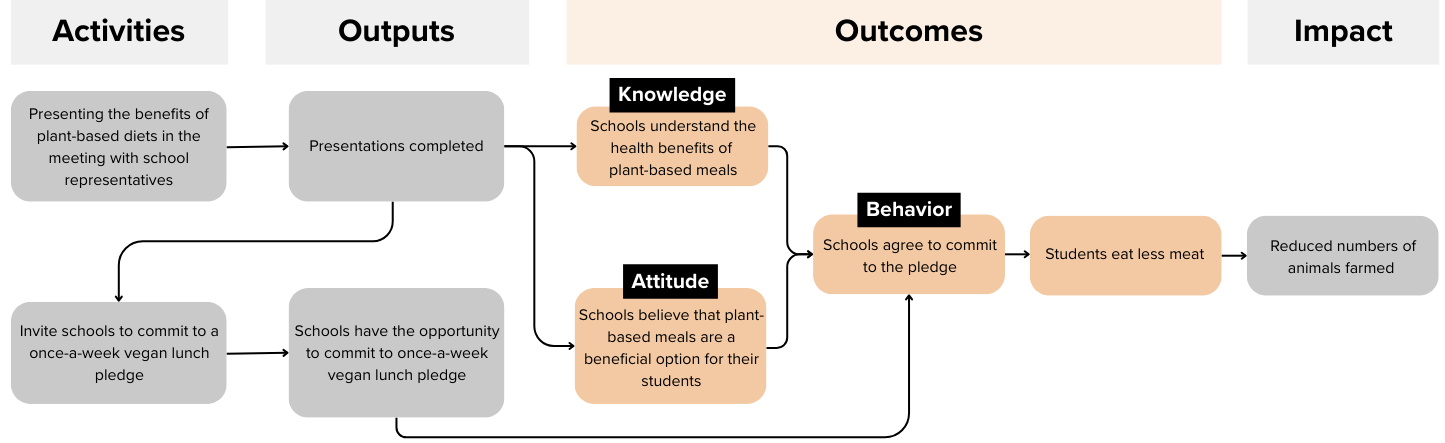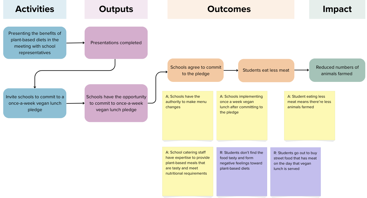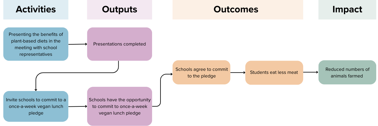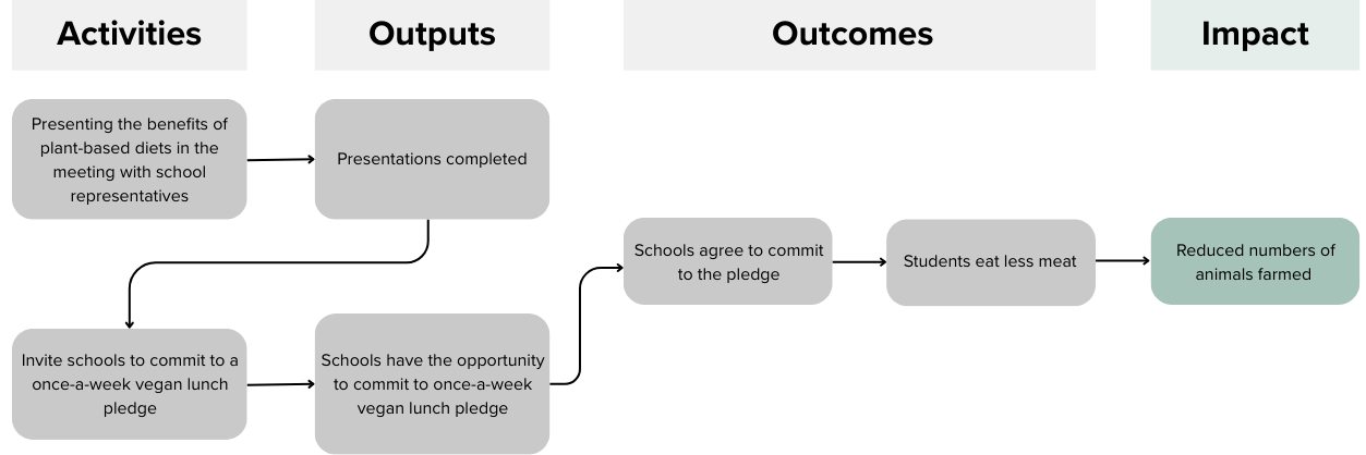 As you can see, activities and outputs are the part of the ToC that involves our actions engaging directly with stakeholders, that is advocates ‘Presenting the benefits of plant-based diets in the meeting with school representatives’ (activity). Once it has happened, a direct result of that activity would be ‘Presentations completed’ (output). After finishing the presentation, you’d want to ‘Invite schools to commit to a once-a-week vegan lunch pledge’ (activity), then the ‘Schools will have the opportunity to commit to once-a-week vegan lunch pledge’ (output).