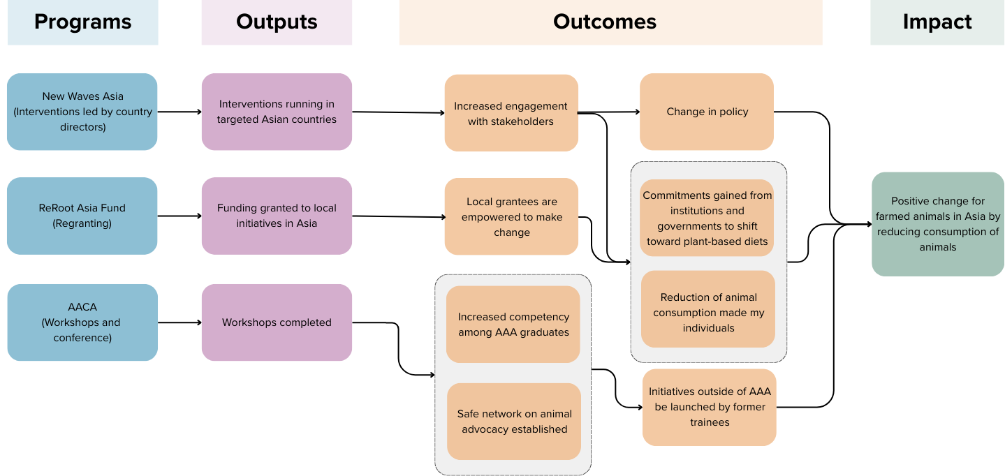 At AAA, an organizational level Theory of Change (ToC) was developed by Ailya Khan, AAA’s Strategy Lead, with support from The Mission Motor. It serves as an umbrella framework guiding all of our programs, ensuring that they would strategically contribute to the impact we’re aiming for a positive change for farmed animals in Asia. For the sake of demonstrating, we will present you a simplified version of AAA’s ToC in the upcoming section, as well as another made-up example of a vegan school lunch program that will show how you can apply ToC to your own project.